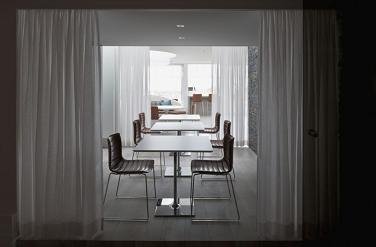 Világos, családbarát, tengerparti dűnékre néző helyet kellett létrehozni. Kétféle padlóburkolatot használtak, világosszürke epoxy-t és fehérített tölgyet. A kedvenceim a füstüveg leválasztások, melyek ugyan elkülönítik az asztalokat, de az átláthatóság megmarad illetve a körbeülhető párnázott hófehér “szigetek”.