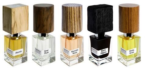 Egyszerű és szép üvegcsék, nagyszerűen kitalált arányokkal, fa kupakokkal az illatoknak megfelelő színekkel és formákkal.