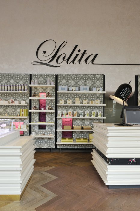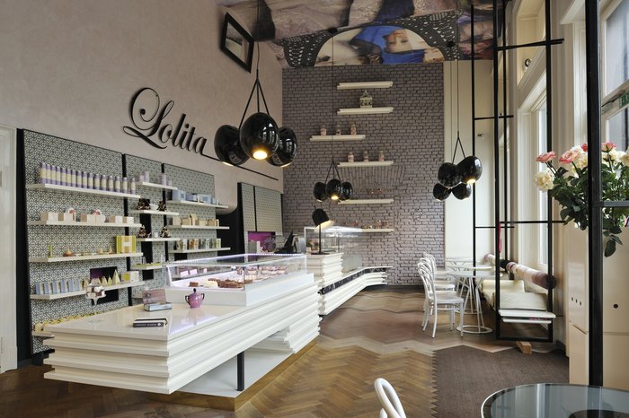 Az üzlet egy U alakú helyiség, két bejárattal. Egyik végén vitrinekben láthatóak a finomságok, beljebb haladva pedig már tornyosulnak a tökéletesen csomagolt csokoládék.