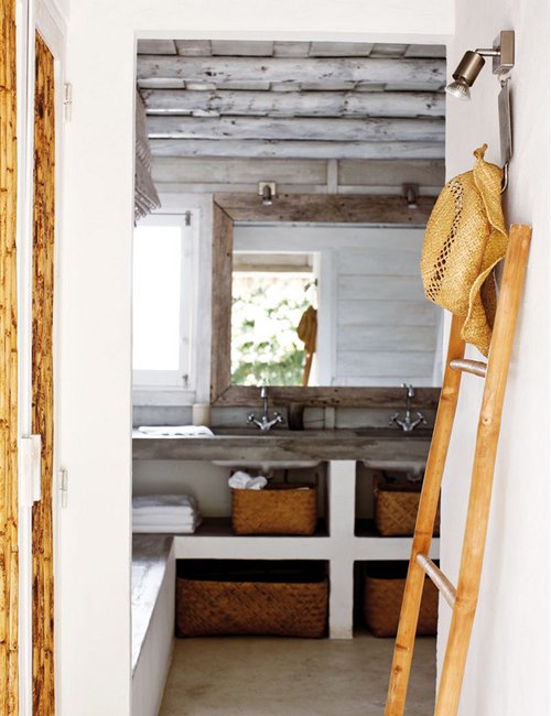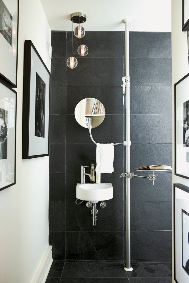 A vendég fürdőszoba mosdó, tükör és törülköző tartó állványa kissé indusztriális jelleget kölcsönöz a helyiségnek. Az falon és a padló látható fekete kő az úgynevezett “indián gránit”.
