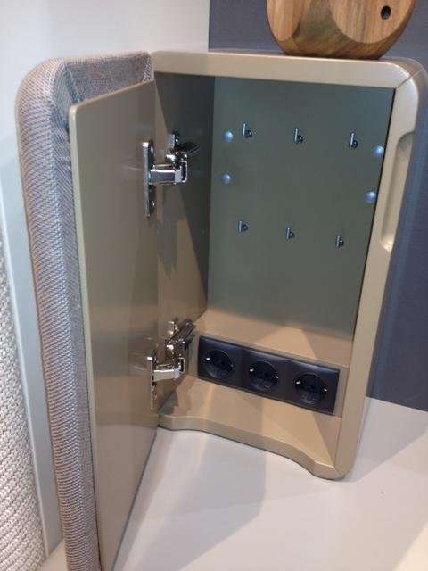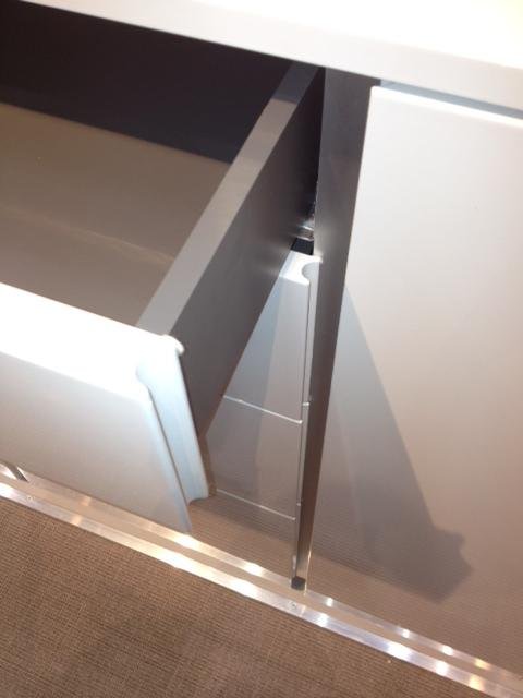 A legokosabb és legszebb fogantyú nélküli megoldás, ha oldalról, könnyen, akár egy újjal is nyitható egy fiók vagy szekrény. Ebben a bútorban csak úgynevezett “soft colsing” mechanika van és ez bőven elég is. (A fiók behúzza magát.)